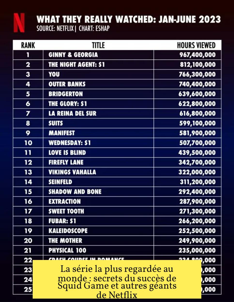 La série la plus vue au monde, selon le classement Netflix des heures de visionnage sur les 28 jours suivant sa sortie, est sans conteste Squid Game. Avec un total hallucinant de 1,6 milliard d’heures de visionnage, ce show sud-coréen a littéralement explosé les records dès sa sortie en septembre 2021.