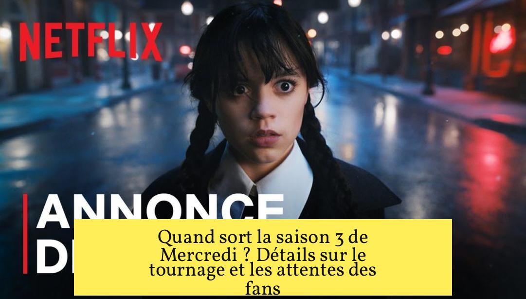 La saison 3 de la série Mercredi est en préparation, mais aucune date officielle de sortie n’a encore été annoncée. Le tournage devrait débuter fin novembre 2025 en Irlande, ce qui laisse envisager une sortie au plus tôt en 2026.