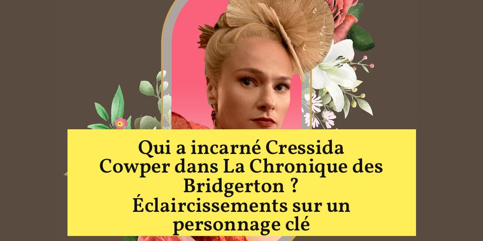 Dans la série La Chronique des Bridgerton diffusée sur Netflix, Cressida Cowper est un personnage. Facile à retenir. Mais qui se cache derrière ce rôle ? Notre passage clé nous parle de “quelques célébrités, comme Jessica Madsen, ou Cressida Cowper”. Alors, Jessica Madsen joue un rôle dans la série, mais pas forcément celui de Cressida Cowper. En fait, le texte ne donne pas explicitement le nom d’un acteur ou d’une actrice incarnant Cressida Cowper.