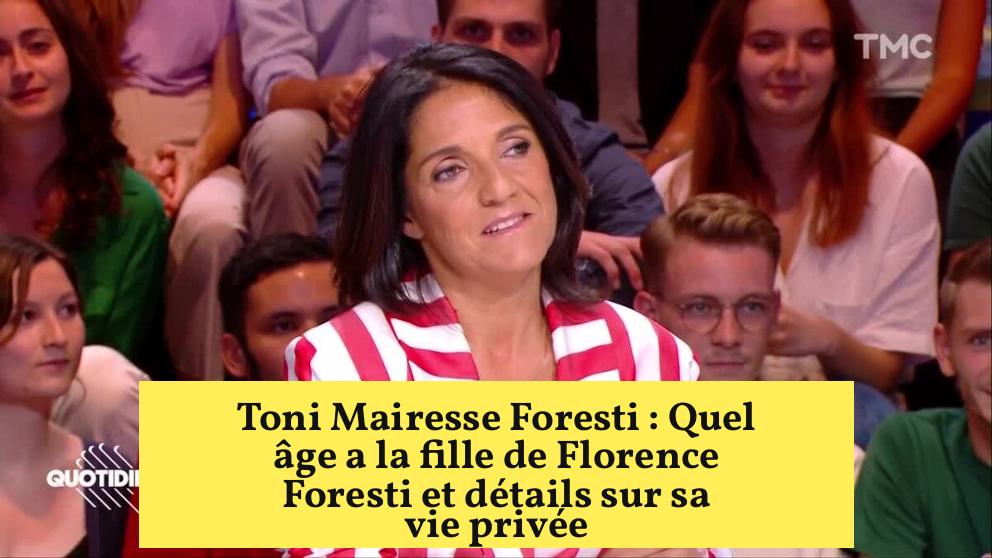 Toni Mairesse Foresti a aujourd’hui 16 ans. Elle est la fille unique de Florence Foresti, née le 10 juillet 2007, et de Julien Mairesse. Sa vie privée est gardée précieusement. Apparitions rares, compte Instagram privé, lien fort mais parfois complexe avec sa mère : voilà le portrait d’une adolescente prête à s’affirmer loin des feux médiatiques. Toni incarne à la fois la relève discrète d’un milieu artistique et l’audace d’une jeune fille qui déteste se laisser enfermer. À suivre.